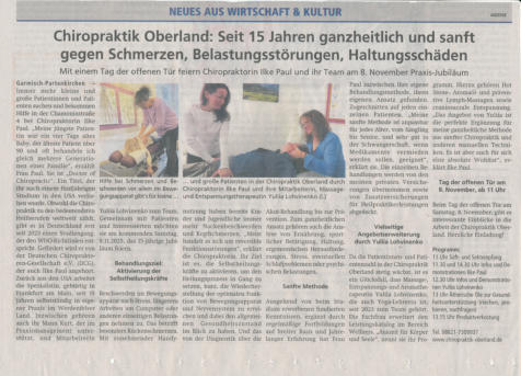 15 Jahre Chiropraktik Oberland-Praxisjubiläum - Zeitungsartikel im