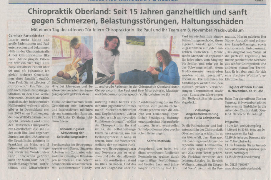 15 Jahre Chiropraktik Oberland-Praxisjubiläum - Zeitungsartikel im